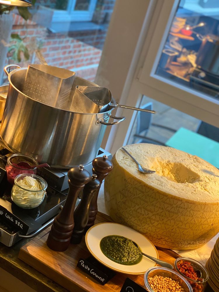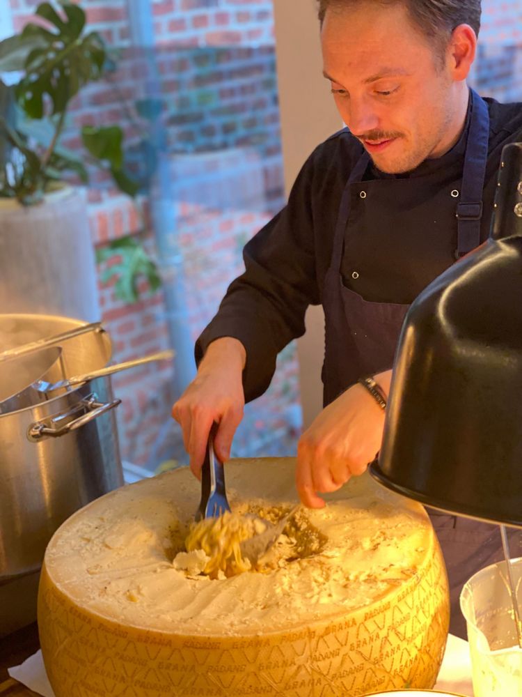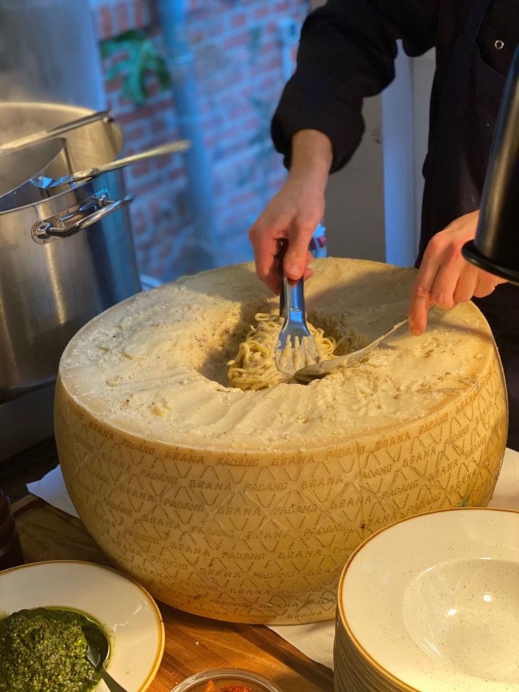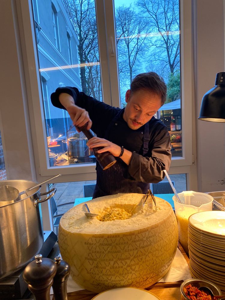 Ein echter Showstopper: Pasta wird live im goldgelb-flambierten Parmesanlaib geschwenkt.